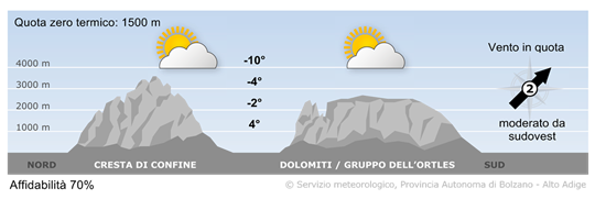 La giornata inizierà con locali formazioni di nubi basse. Di seguito in cielo si alterneranno sole e nuvolosità d'alta quota. Temperature minime tra -9° e 0°, massime tra 2° e 9°.